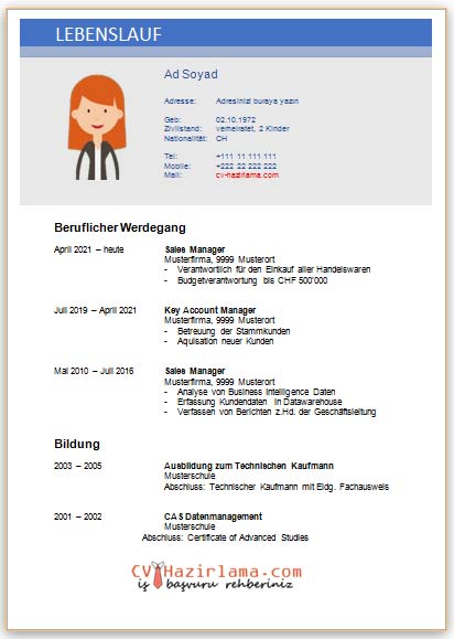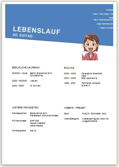 Almanca olarak hazırlanmış cv örneklerini inceleyerek sizde kolayca kendi CV’nizi oluşturabilirsiniz. Almanca olarak CV Lebenslauf anlamına gelmektedir. CV’nin bölümlerini almanca olarak girmelisiniz.