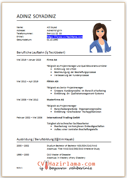 Almanca CV‘nizi oluşturmadan önce kendi CV’nizi Türkçe olarak hazırlayın. Hazırladığınız CV başlıklarını Almanca olarak CV’de düzenleyin. Başlıkları değiştirdikten sonra adres, telefon, mail gibi bilgileri Almanca karşılıklarını girmelisiniz.